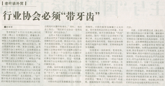 老葉談外貿(mào):行業(yè)協(xié)會(huì)必須“帶牙齒”(轉(zhuǎn)自民營經(jīng)濟(jì)報(bào))······